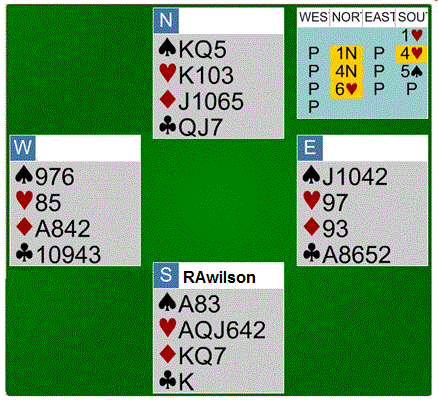 Eddie Kantar wrote four different books trying to describe how to overcome the problems with RKC, and numerous auxiliary conventions such as Kickback, Redwood, Minorwood, etc, have been devised to compensate for the failures inherent in it, but it is still one of the world's most popular conventions. Four books! And yet, two players will sit down to play for the first time and one will ask, "Fourteen thirty or the other?" "No, I play zero three one four." And with that they go on to the next item on the card. So much for Eddie's four books. Good and Bad The idea of making the king of trump equivalent to an ace was a great improvement over the old standard Blackwood, and being able to ask about the queen is almost as valuable. RKC works wonderfully well when your trump suit is spades, but not so well with hearts, and is awful with the minors. (To be fair, standard Blackwood is no better when your trump suit is a minor, especially clubs!) Let me show you a disaster caused by the misuse of RKC. This hand occurred on BBO, BridgeBase Online.